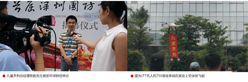 深圳市特種產(chǎn)業(yè)協(xié)會秘書長趙熙在采訪中表示,今年是中國人民抗日戰(zhàn)爭暨世界反法西斯戰(zhàn)爭勝利70周年。為了紀(jì)念70年前那場艱苦卓絕的民族抗戰(zhàn),銘記歷史、緬懷先烈、珍愛和平、開創(chuàng)未來,深圳市特種產(chǎn)業(yè)協(xié)會在深圳市國防科技工業(yè)辦公室、南山區(qū)政府的悉心指導(dǎo)以及社會各界的關(guān)懷下,組織深圳軍工相關(guān)企業(yè),隆重舉辦“首屆深圳國防書畫展”。深圳九星天利科技有限公司作為軍工企業(yè)的無人機(jī)科技行業(yè)的佼佼者,也被邀請為此次展會的特約嘉賓。