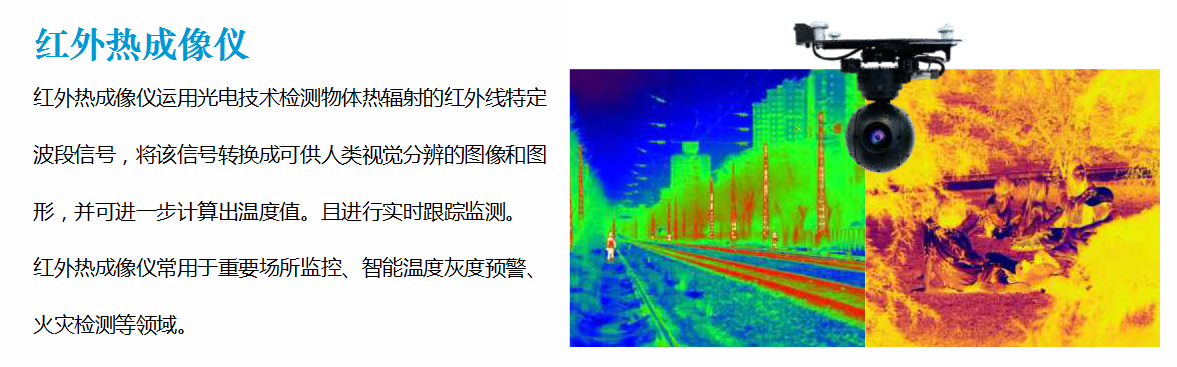 主要針對夜間光照條件差的情況下進行火點及高溫點的監(jiān)控巡邏。巡邏路線可按照人流密集區(qū)域設置,鏡頭可清晰覆蓋航線周邊1km以上半徑范圍區(qū)域。三個左右航線基本可以覆蓋全部危險區(qū)域。