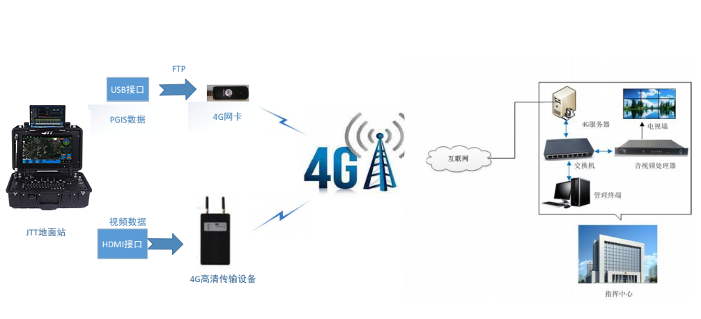 無(wú)人機(jī)在巡檢時(shí)高空拍攝到的圖像和視頻以及無(wú)人機(jī)的坐標(biāo)、高程信息通過(guò)無(wú)線通信鏈路傳輸?shù)降孛嬲竞?,可通過(guò)專用有線網(wǎng)絡(luò)與現(xiàn)場(chǎng)的移動(dòng)前置機(jī)形成數(shù)據(jù)通路,也可借助4G網(wǎng)絡(luò)把數(shù)據(jù)輸入到內(nèi)網(wǎng)的數(shù)據(jù)庫(kù)中并連通到應(yīng)急指揮調(diào)度平臺(tái)。通過(guò)這種方式,巡檢現(xiàn)場(chǎng)的第一手資料與龐大的數(shù)據(jù)庫(kù)之間就形成了協(xié)同作戰(zhàn)的態(tài)勢(shì)。無(wú)論是領(lǐng)導(dǎo)指揮還是第一線巡檢人員的具體執(zhí)行都將得到有力、有效和迅速的信息支撐。