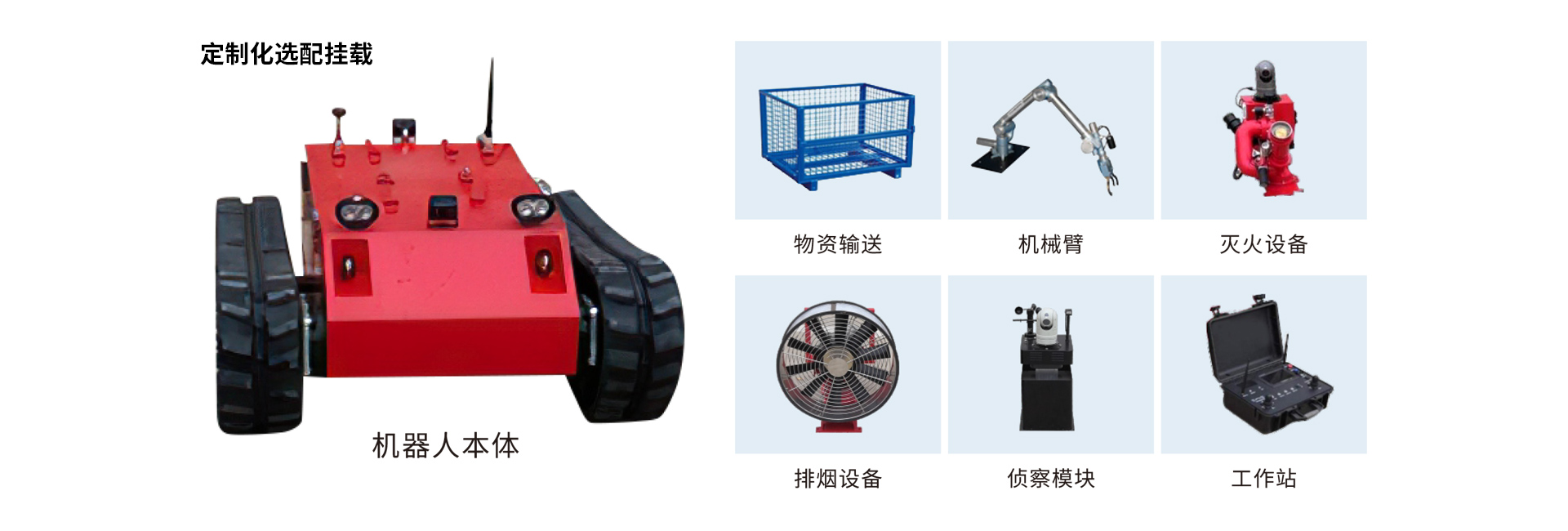 集滅火、排煙、偵察、排爆、破拆、物資輸送等功能于一體,采用創(chuàng)新的系統(tǒng)設計理念,上裝設備具備標準控制接口,快速裝卸接口,應用現(xiàn)場即時更換,一機多用,更低的使用成本,更高的使用效率。